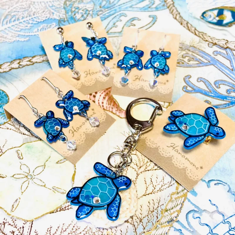 8月の新作『カメ』 新作 2022.08.25 河内長野にあるハワイアンカフェ「Bbcafe」さんよりハワイアンな作品をとのご依頼があり、ウミガメ(ハワイ語でホヌ)を制作。 海の色に甲羅の模様が波のように見えるアクセサリーが完成しました。 自己流でのアクリル画の研究は、筆先を平らにカットし、ガッシュとリキテックスを使い分けながら、不透明で消しては透明で書き込んで‥の繰り返しで、シンプルな画面構成に奥行きのある色づかいを目指して描いてみました。